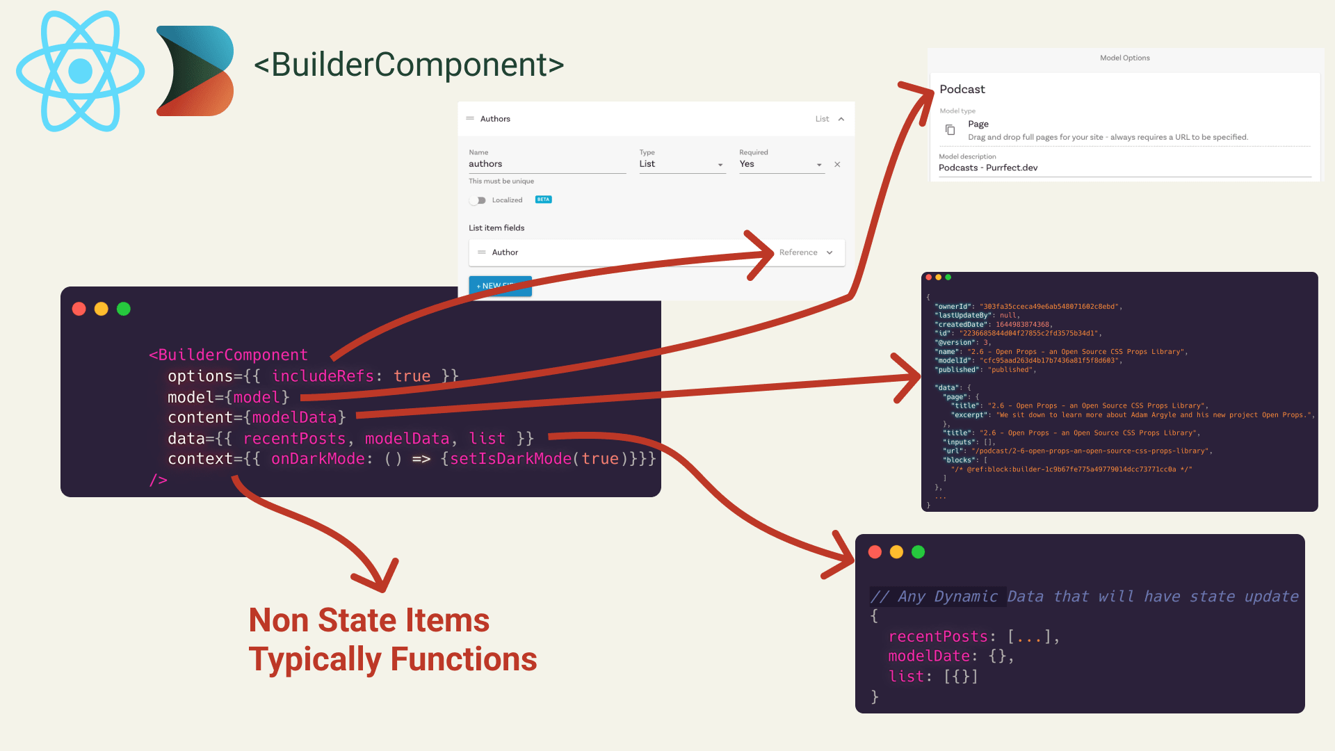 Below is a breakdown that I made so that you can understand what all the props for the BuilderComponent actually do. As you can see data is meant to include dynamically changing state data, and content will be your pages data as Described by the Builder.io JSON.